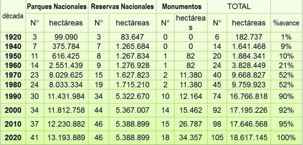 El Sistema Nacional de Areas Silvestres Protegidas del Estado ha tenido un gran desarrollo,  pasando de 45 unidades con 9.8 millones de hectáreas el año 1970, a 110 unidades con 19 millones de hectáreas hoy, repartidas entre la Línea de La Concordia y el Cabo de Hornos, transformándose de este modo en la columna vertebral de la Protección de la Naturaleza y la Biodiversidad en Chile.