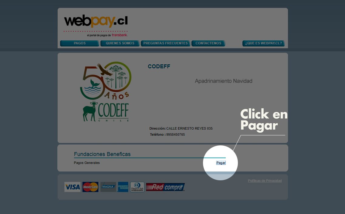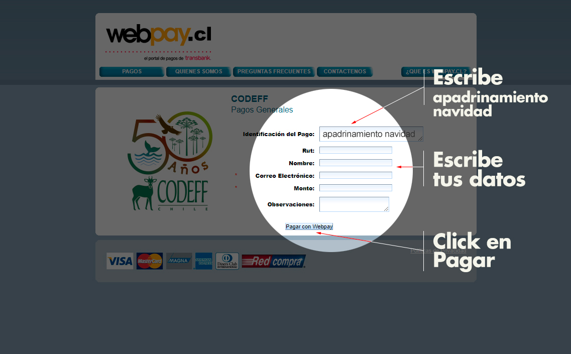 Luego, en la sección identificación del pago escribe APADRINAMIENTO NAVIDAD, tus DATOS PERSONALES, el MONTO que donarás y en OBSERVACIÓN envíanos un saludo o deja algún comentario sobre el apadrinamiento navidad.