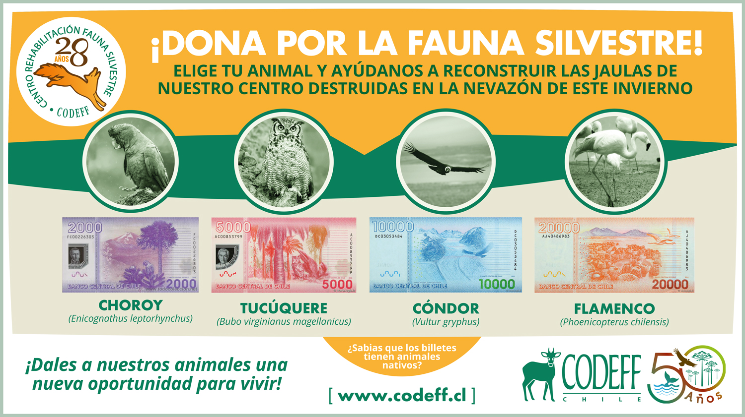 Mediante una innovadora campaña que visibiliza los animales nativos que se encuentran en los billetes nacionales, CODEFF busca sensibilizar a la ciudadanía y juntar dos millones de pesos para reconstruir jaulas destruidas por la nevazón que afectó el Cajón del Maipo el pasado mes de junio.