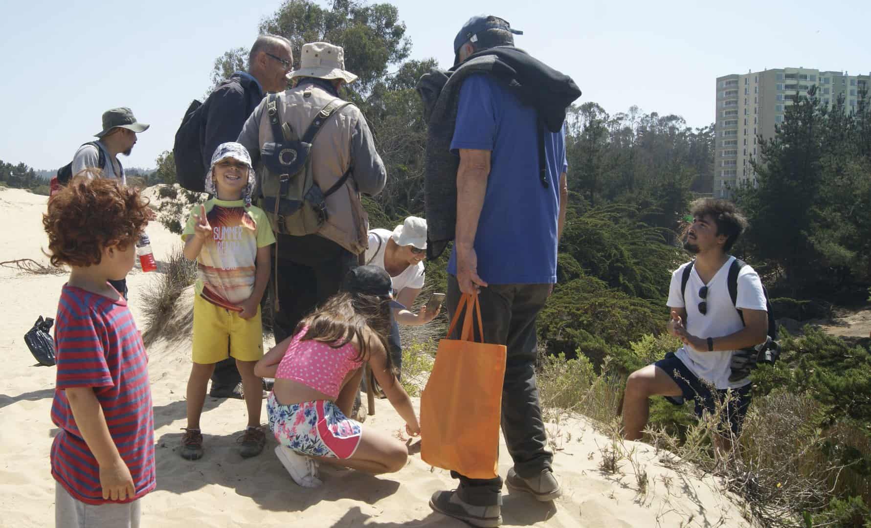 Adentrándose en pleno campo dunar, siguiendo hacia el norte por el borde del sendero de uno de los esteros, el grupo llegó hasta el sector reconocido como Gota de Leche, en donde además de tomar contacto con la naturaleza y recoger basura, los niños disfrutaron de sus improvisados juegos bajo los añosos árboles allí presentes.